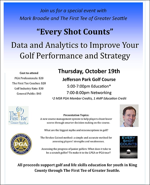 Join the First Tee of Greater Seattle and the Western Washington PGA Chapter on Thursday, October 19, 2017 at Jefferson Park GC for an educational session featuring guest speaker Mark Broadie “The Doctor of Golf” and author of Every Shot Counts.