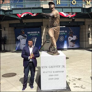 Ken Griffey Jr. stands next to his newly-unveiled statue outside Safeco Field (also known as The House That Griffey Built) during the ceremony of the statue’s dedication on April 13, 2017. (Photos by Josh Kerns)