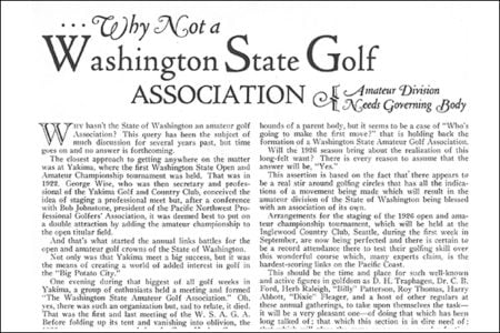 By conducting business, according to news accounts at the time, these six people – J.C. Adams of Bellingham Golf and Country Club, W.W. Baker of Walla Walla Country Club, Neil Jamison of Everett Golf and Country Club, J.P. Kohls of Yakima, Alex Rose of Earlington Golf and Country Club, and Brown of Grays Harbor – informally created the Washington State Golf Association.